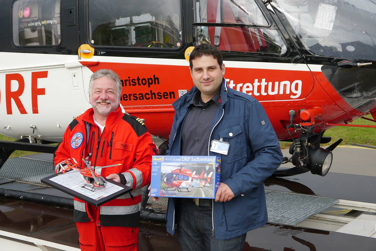 Die DRF Luftrettung betreibt an ihrer Station am Flughafen Hannover einen Hubschrauber des Typs EC145, der als Vorbild für unser im September auf den Markt gekommenes Modell diente. Daher war es für uns Ehrensache, dass wir der Station als Dank für deren tatkräftige Unterstützung ein fertig gebautes Modell übergeben wollten.