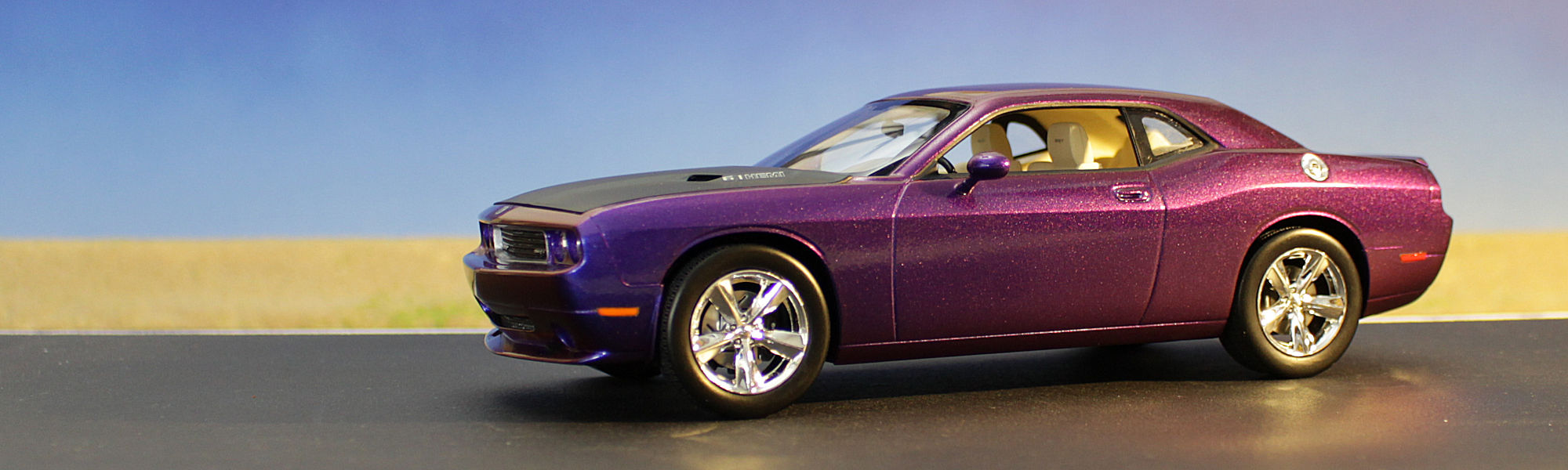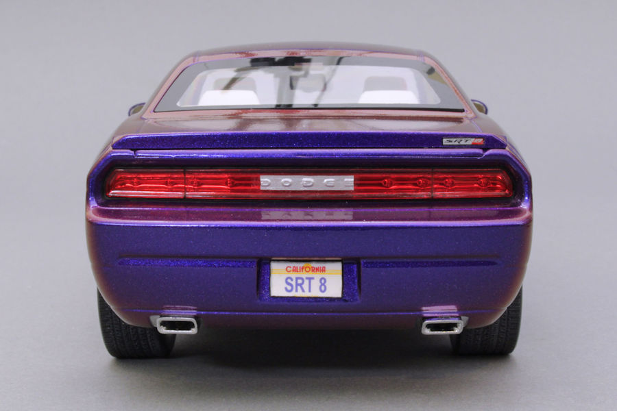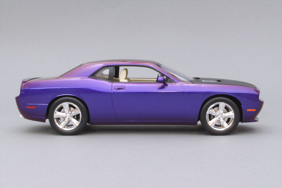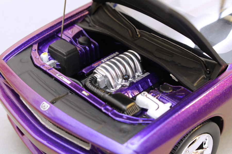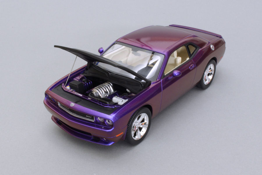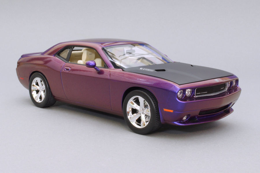 im aktuellen Beitrag stelle ich meinen 2009er Dodge Challenger SRT8 im Maßstab 1:25 vor. Gebaut wurde der Bausatz wie er aus der Schachtel kam, also ohne Modifikationen oder Extrateile. Das Besondere an diesem Modell ist seine Farbe: es handelt sich dabei um einen Flip-Flop-Lack aus dem Kfz-Handel, der je nach Lichteinfall in unterschiedlichen Farben schimmert. Nicht nur die Karosserie sondern auch Teile des Motorraums wurden damit lackiert.
