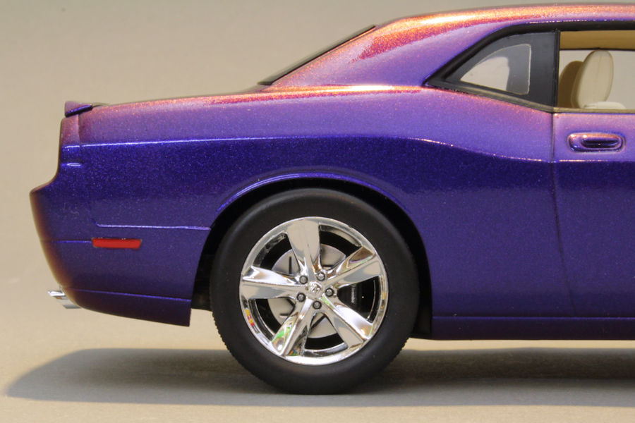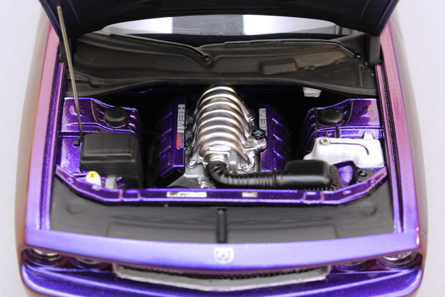Der Bausatz des Dodge Challengers ist von Revell USA. Im Gegensatz zu den Modellen aus deutscher Entwicklung besitzen die US Cars keine funktionale Lenkachse, außerdem verzichten die Amerikaner darauf, den Bausätzen Seitenscheiben beizulegen. Dafür wird hier das Starrachsen-Konzept des Originals auch am Modell umgesetzt: die Hinterräder werden an einer durchgehenden Metallstange fixiert. Passgenauigkeit und Detaillierung sind in gewohnt hoher Revell-Qualität, besonders der Motorraum mit dem Hemi-V8 unter der beweglichen Motorhaube ist sehr schön wiedergegeben.