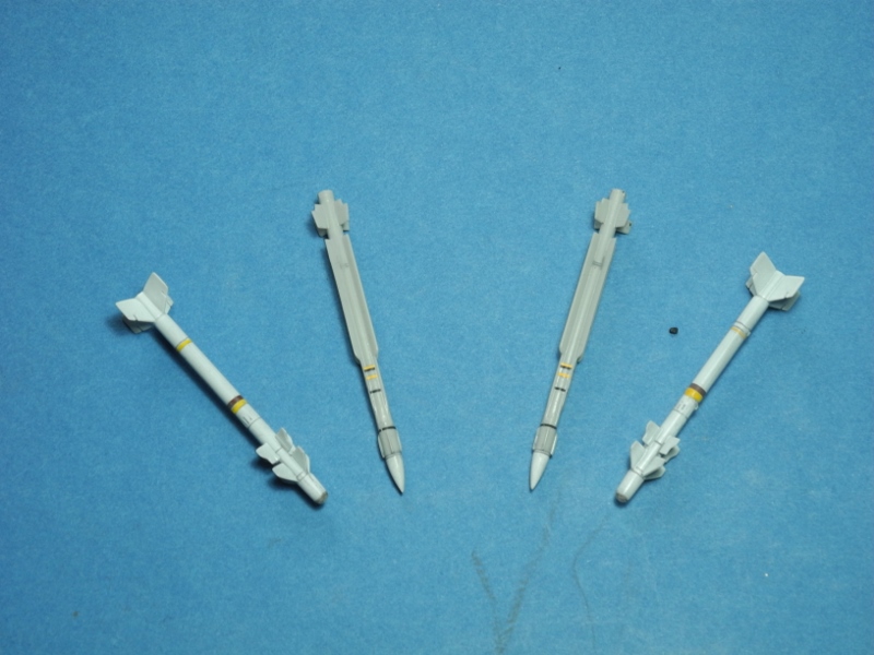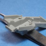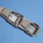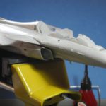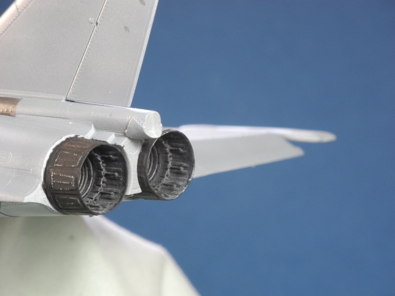 Anstelle der revelleigenen Schubdüsen, die an sich gar nicht schlecht sind, griff ich an dieser Stelle doch auf eine Alternative aus Resin zurück. Zwar findet sich für die Rafale B (warum auch immer) nicht so sonderlich viel auf dem Zuberhörmarkt, Schubdüsen (von Wolfpack) konnte ich aber dennoch auftreiben. Eigentlich mag ich die Produkte von diesem Hersteller überhaupt nicht, denn die müffeln wie ein Treibstofflager. Als „Zubehör-Junkie“ konnte ich aber einfach nicht widerstehen. So machte ich mich daran, unter „ABC-Vollschutz“, diese Teile anstelle der genannten Bauteile unter Bauabschnitt 14 zu verarbeiten.
