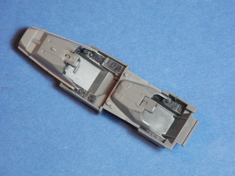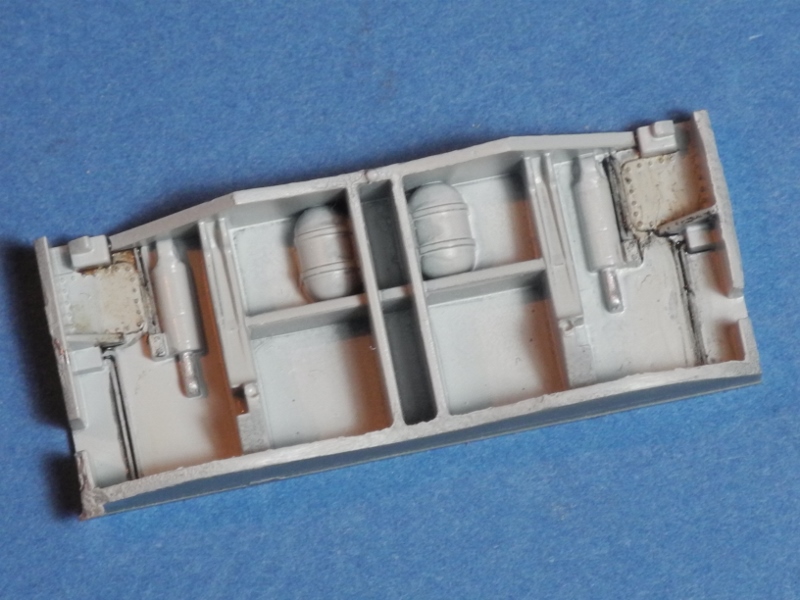Weiter ging es mit den Schritten 12 bis 13 – den Fahrwerksschächten. Vor der Montage lackierte ich diese mit einem hellen Grau. Leider wird dieses Grau auf den nachstehenden Bildern als Weiß wiedergegeben. Hier verzichtete ich, im Gegensatz zur Cockpitsektion, auf eine umfassende Detailbemalung; nach dem Einbau würde davon eh nicht mehr viel erkennbar sein.