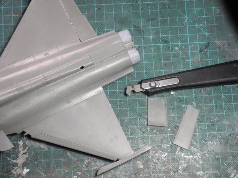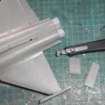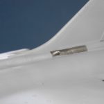 Abweichend von der vorgegebenen Reihenfolge der Bauanleitung, montierte ich als nächstes beide Flügel. Da auf den Vorbildfotos die Ruder bei den abgestellten Rafale immer ausgelenkte Ruder erkennbar waren, beschloss ich dies auch bei meinem Modell so umzusetzen. Mittels eines beherzten chirurgischen Eingriffes und ein wenig Anpassungsarbeit war dieses Vorhaben dann auch schnell erledigt.