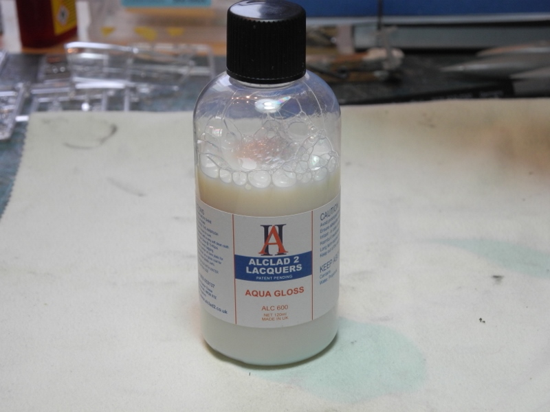 Vor der anstehenden Decalorgie versah ich den Flieger noch mit einer dünnen Schicht glänzendem Klarlack. Hierzu kam folgendes Mittelchen zum Einsatz.