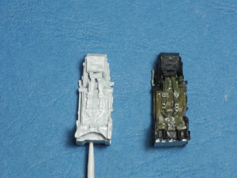 Es konnte mit dem Einrichtungsmobilar weitergehen. Genau wie bei den Triebwerken, bemühte ich auch hierbei den Zuberhörmarkt und griff bei den Schleudersitzen auch auf das Angebot von Wolfpack zurück. Ähnlich wie bei dem Cockpit stand auch hier eine aufwendige Mikrobemalung an.