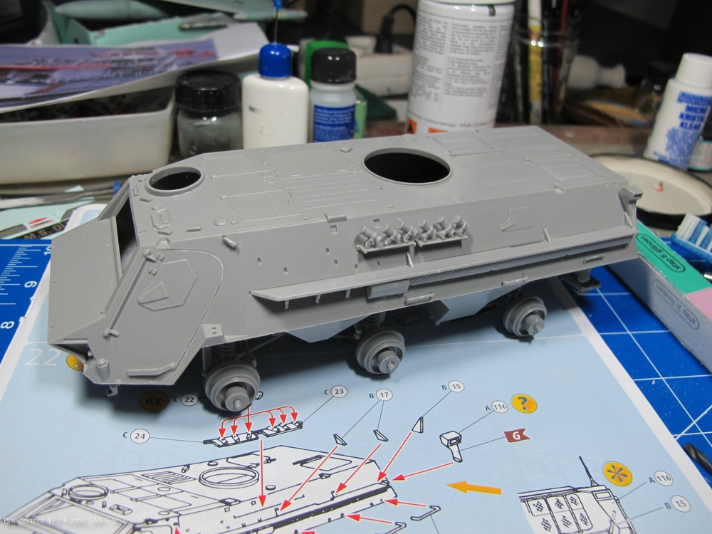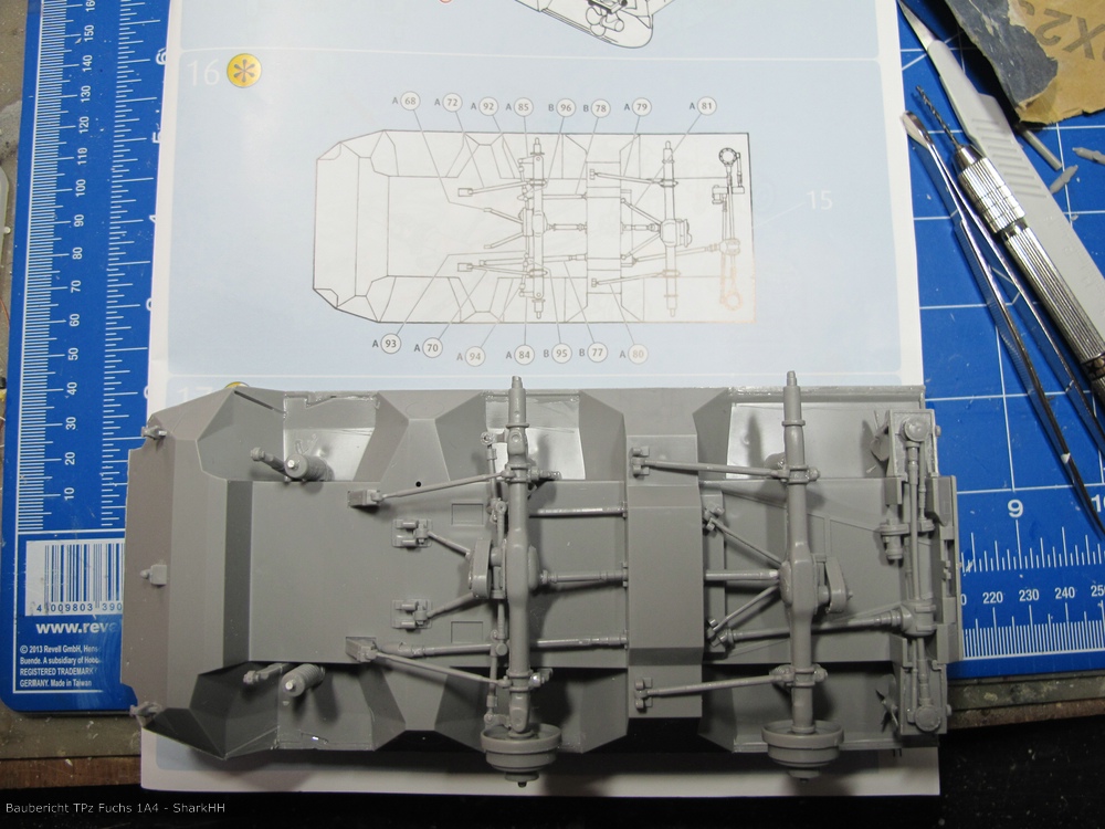 Die Bauteile A97-A99 sollten vor den Querlenkern A100 und A101 montiert werden. Nach gut 4 Stunden Bauzeit nimmt der Fuchs langsam Formen an.