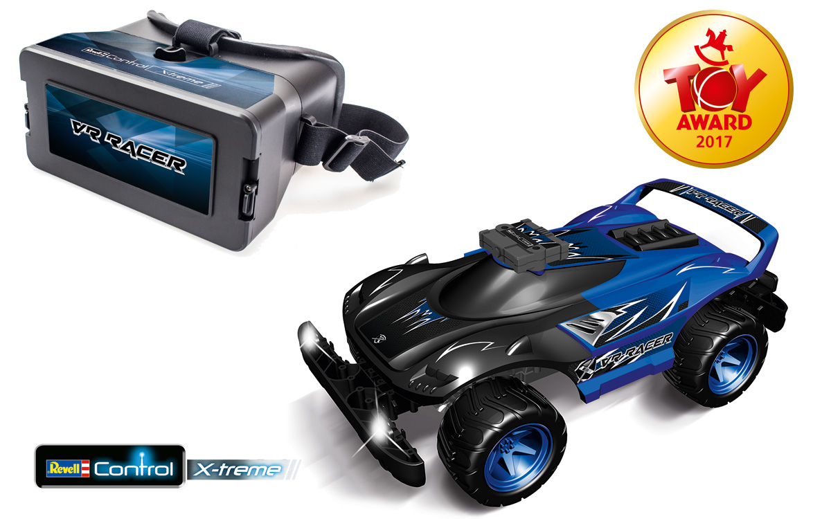 Der „VR Racer“ gehört zu den Neuheiten 2017 der Linie Revell Control X-treme. Das Fahrzeug vereint die unvergleichlichen Outdoor-Eigenschaften der Produktlinie mit einem völlig neuen Fahrgefühl: Dank Virtual Reality hat der Fahrzeugführer das Gefühl, direkt im Auto zu sitzen. Die Kamera auf dem Dach des Fahrzeugs überträgt mit Hilfe einer Gratis-App ihr Live-Bild direkt auf das Smartphone des Fahrers. So taucht er zusammen mit der enthaltenen VR-Brille in die Virtual Reality ein. Diese Technik macht den „VR Racer“ mit zuschaltbaren Scheinwerfern zu einem der Highlights 2017! Das sieht auch die Jury des „ToyAward 2017“ so und verlieh diesem Modell bei der feierlichen Eröffnung der Spielwarenmesse den Preis in der Kategorie „Teenager & Adults“. Diese wiederholte, renommierte Auszeichnung sorgt auch im Hause Revell für Stolz. „Die Verleihung des „ToyAward 2017“ für den „VR Racer“ steht nicht nur für die herausragende Innovationskraft dieses Modells, sondern der Preis steht gleichzeitig auch für das enorme technologische Potenzial der gesamten Revell Control X-treme Linie.“, freut sich Andreas Bittlinger, Head of Marketing bei Revell.