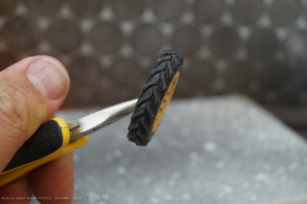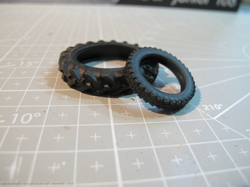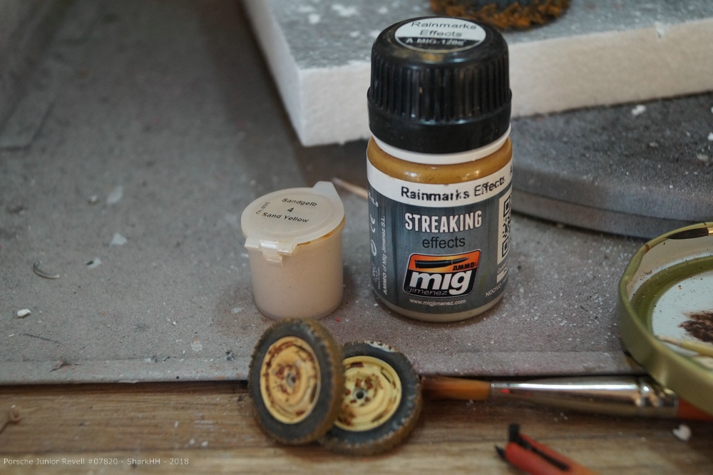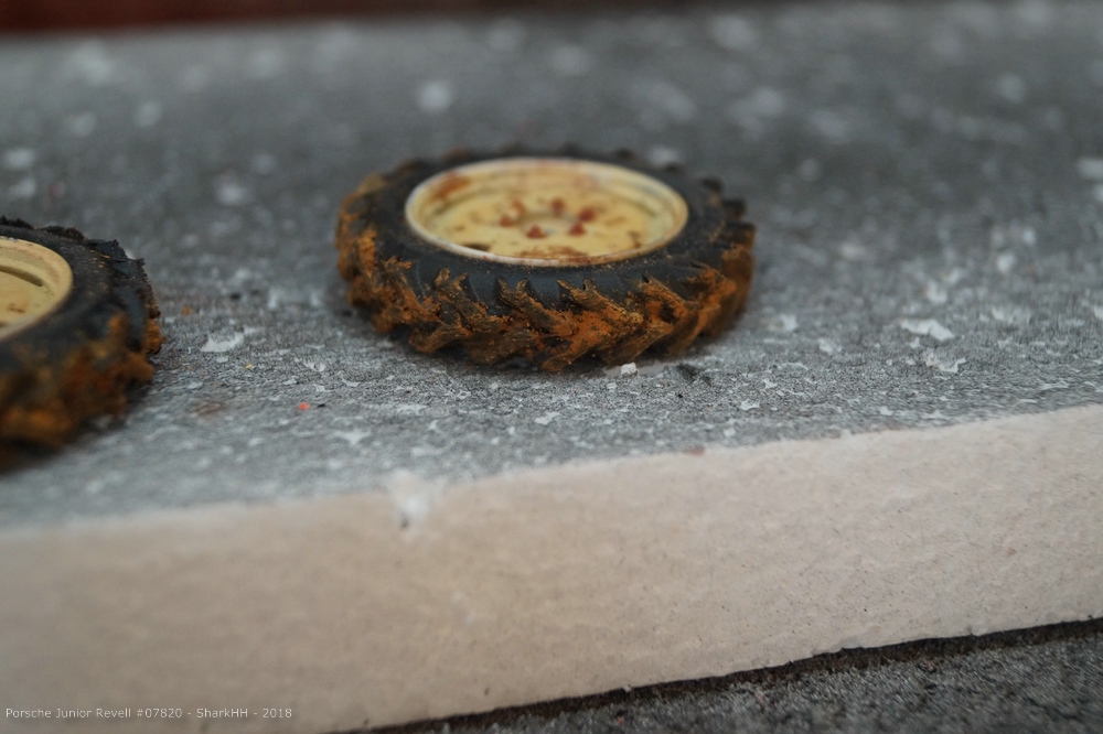 Die sehr schön profilierten Reifen habe ich etwas abgeschliffen und anschließend mit Pigmenten verschmutzt. Für die feineren Vorderreifen griff ich auf ein helles Washing zurück. Überschüssige Farbe entfernte ich wieder mit dem geruchslosen Terpentin.