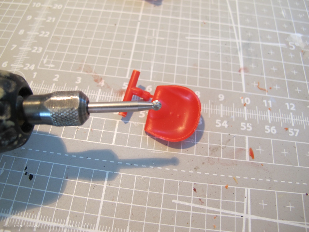 Die Lackierung erfolgt mit dem Airbrush. Dafür habe ich die Teile zunächst mit dem Revell Aqua Basic grundiert. Dann wurde im nächsten Schritt (Rost-)Löcher und Beulen eingebracht. Hierzu wurde das Material an einigen Bauteilen mit einem Rosenkopffräser ausgedünnt. Hier ist äußerst vorsichtig vorzugehen. „Gründlichkeit geht vor Schnelligkeit“ ist das Motto. Sonst fräst man sich schnell durch das Material und dann ist flicken angezeigt.