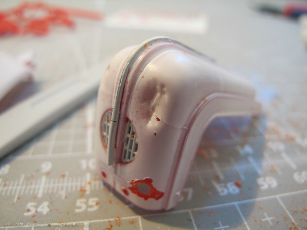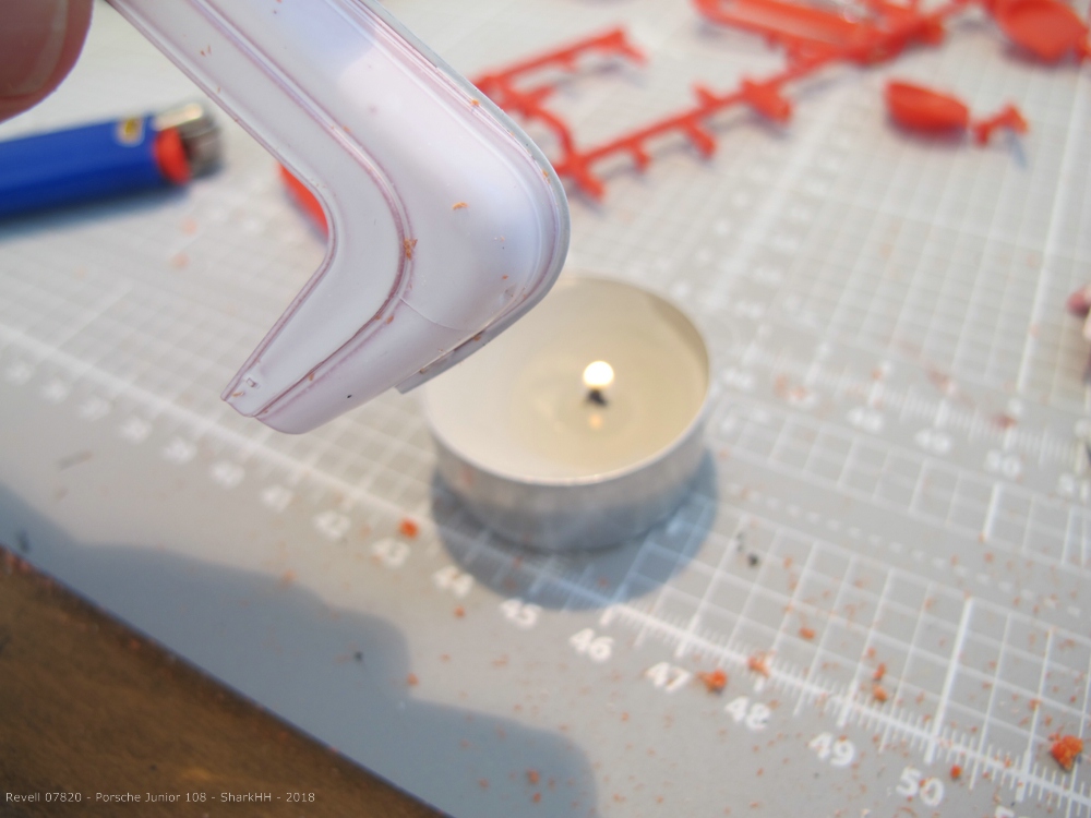 Weiter ging es mit den Beulen. Auch hier ist äußerste Vorsicht geboten, da sich Plastik unter Wärmeeinwirkung verändert. Ich habe ein Teelicht genommen und habe die Motorhaube 2-3 Sekunden knapp über der Flamme gehalten und dann das Teil noch ein paar Mal ganz kurz über die Flamme gehalten. Mit einem Schraubendreher habe ich dann die Motorhaube eingebeult.