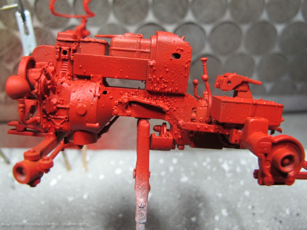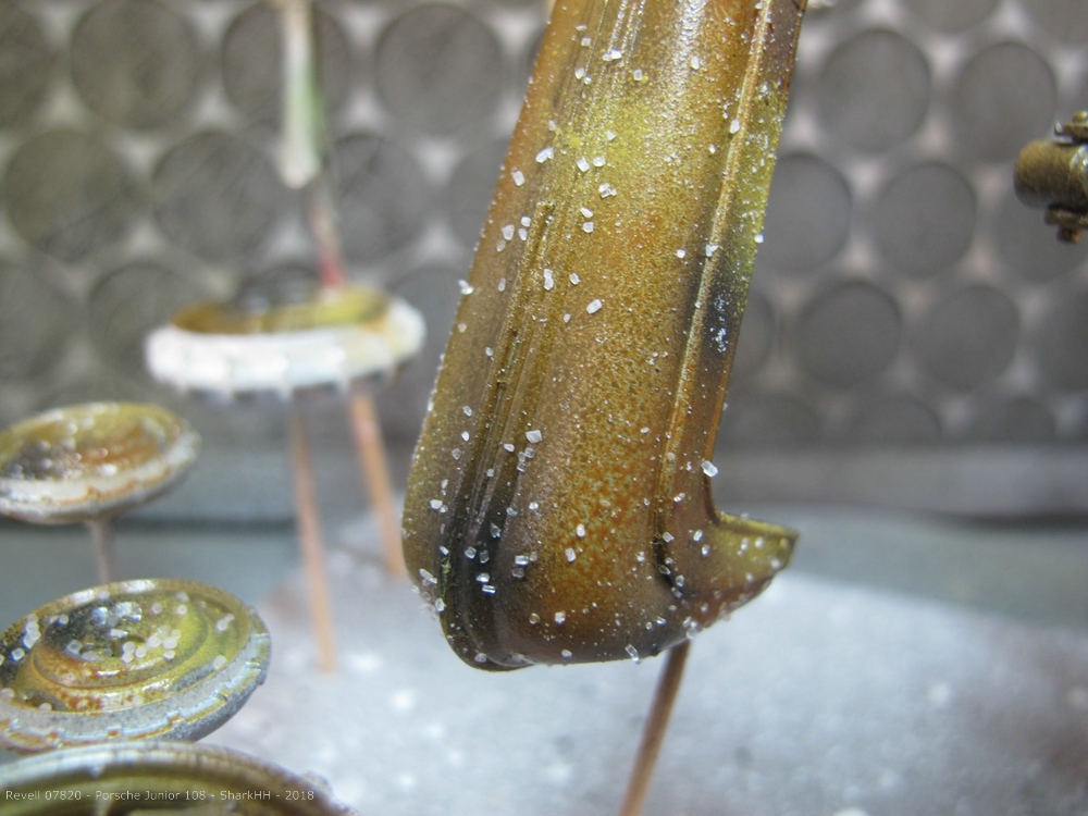 Nach der Grundierung wurden die Teile mit verschiedenen Brauntönen vorlackiert. Da ich das Modell mit der „Salztechnik“ etwas altern möchte, wurde anschließend der „Rost“ mit Klarlack versiegelt. Auf den noch feuchten Klarlack wird nun das Salz vor dem eigentlichen Farbauftrag auf das Modell aufgebracht. Anschließend kann mit dem ersten Farbauftrag der Grundfarbe Revell Aqua 36 Karminrot begonnen werden. Um etwas Abwechslung in den Farbauftrag zu bringen, wurde einige Bereiche mit Revell Aqua 31 Feuerrot übernebelt.