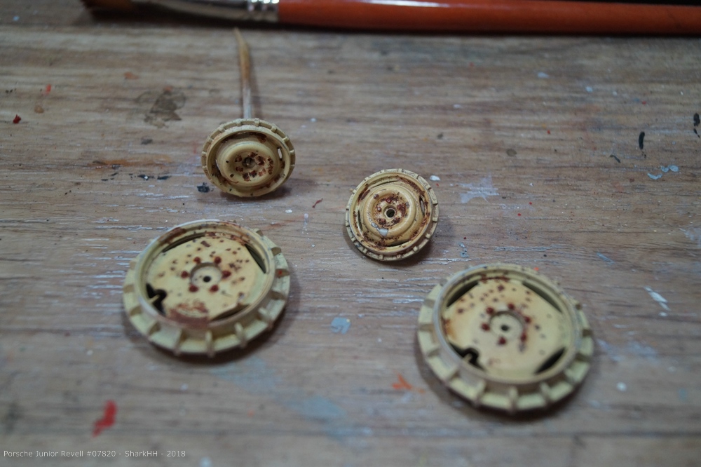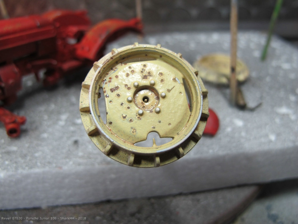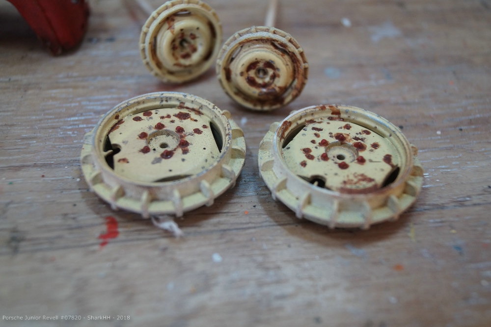 Die letzten Teile wurden montiert und bei den Felgen ging es weiter mit ein paar Korrekturen sowie der Behandlung mit einem Rosteffekt-Washing. Ich verwende nach der Lackierung mit Acryl-Farbe Washings auf Enamel-Basis. Ich greife hierbei auf Fertigprodukte z.B. von MIG oder AK interactive zurück.