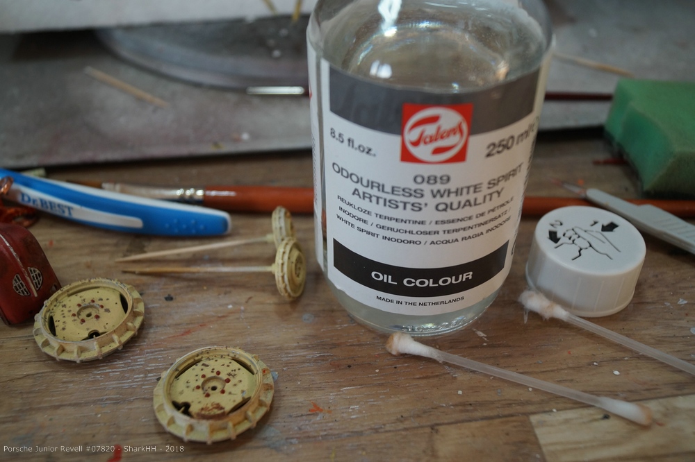Um zuviel aufgetragene Farbe bzw. in diesem Fall Pigmente wieder zu entfernen, greife ich auf sogenanntes „White spirit“ zurück. Ein geruchsfreies Terpentin aus dem Künstlerbedarf. Damit bekommt man i.d.R. die Farbe, die noch nicht ganz durchgetrocknet ist, wieder runter.