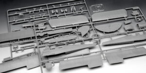 Unser Bausatz des Level 4 für fortgeschrittene Bastler kommt mit 90 Einzelteilen, die ein fertiges Modell mit 23 cm Länge und 28,5 cm Spannweite ergeben.
